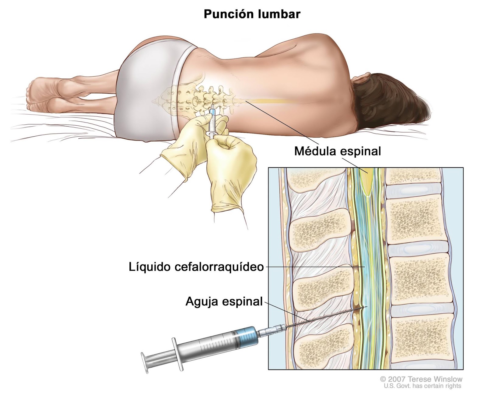 - Se inyecta un anestésico local (como lidocaína al 2%) en la espalda lumbar para anestesiar el sitio elegido para la punción.